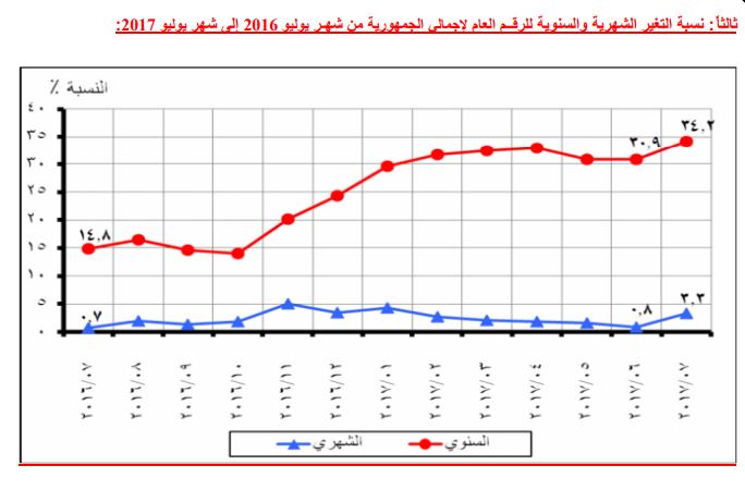 وبدأ معدل التضخم في الارتفاع بشكل كبير خلال النصف الأول من عام 2017، فوصل إلى 28.1% في يناير، و30.2% في فبراير بفارق أقل 0٫4 عن أعلى معدل للتضخم عام 1986، ثم تخطاها في شهر مارس ووصل 30.9%، وفي أبريل تخلف إلى 31.5% فى أبريل، وفي مايو 29.7%، وفي يونيو أحرز 30٫9%، ثم ارتقي في يوليو وفقا لبيان الجهاز المركزي للتعبئة العامة والإحصاء إلى 34٫2% وفقا للمركزي للإحصاء، و35% وفقا للبنك المركزي.