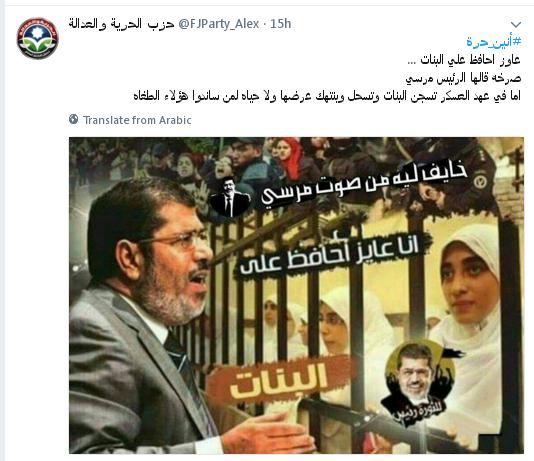 أما صفحة حزب الحرية والعدالة بالإسكندرية فعلقت قائلة: “عاوز أحافظ علي البنات.. صرخة قالها الرئيس مرسي.. أما في عهد العسكر تسجن البنات وتسحل وينتهك عرضها ولا حياة لمن ساندوا هؤلاء الطغاة”.
