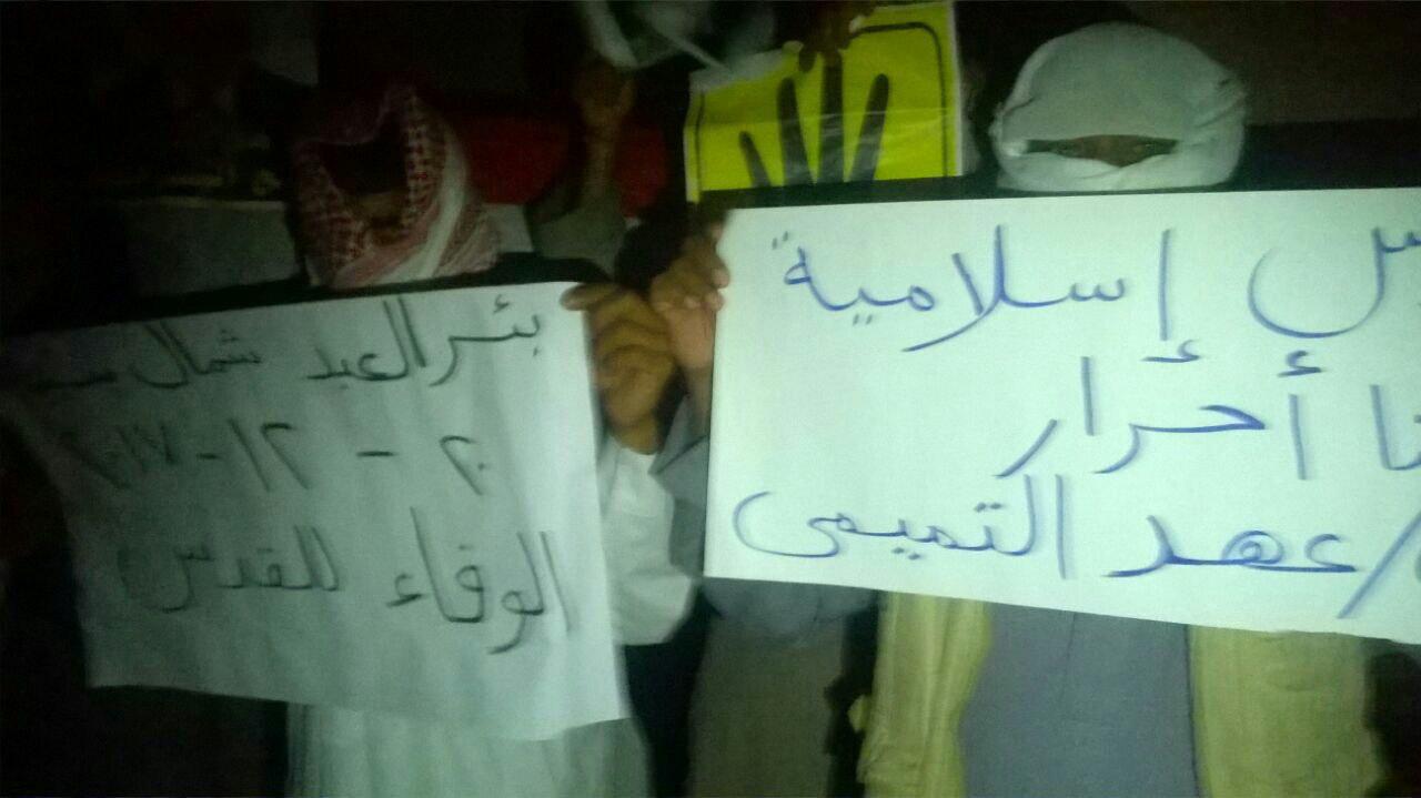 نظم ثوار بئر العبد في سيناء، وقفة ليلية؛ رفضًا للانقلاب العسكري، ضمن فعاليات أسبوع "الوفاء للقدس"، الذي دعا إليه التحالف الوطني لدعم الشرعية ورفض الانقلاب.