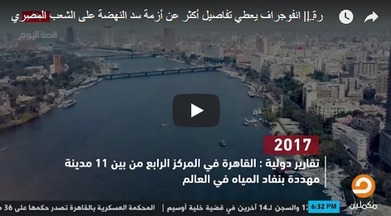 بثَّت قناة مكملين تقريرًا معلوماتيًا حول تعرض مصر لخطر الشح المائي، بعد فقد 15 مليار متر مكعب من حصتها في مياه النيل عقب بناء سد النهضة في إثيوبيا.