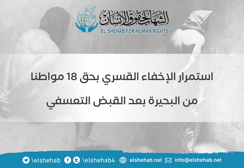 تواصل ميليشيات الانقلاب العسكري جريمة الإخفاء القسري لـ18 من أبناء البحيرة لمدد متفاوتة، منذ اعتقالهم في ظروف مختلفة دون سند من القانون ودون ذكر الأسباب، رغم تحريرهم عدة بلاغات وشكاوى من قبل أسرهم للجهات المعنية.