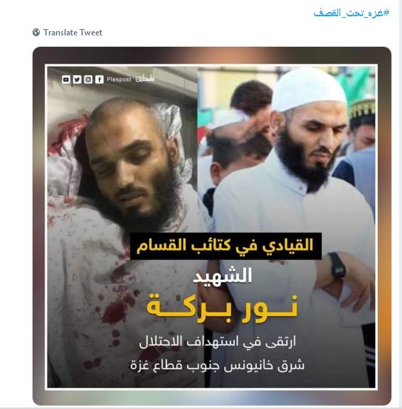 أما حساب باسم” عمر زامل ” من قطاع غزة فكتب يقول.. قوة خاصة للاحتلال اغتالت الشهيد القائد نور بركة شرق خانيونس أحد قادة كتائب القسام .الشيخ القائد/ نور بركة..ماجستير فقة..حاصل على السند المتصل بالقراءات العشر.
