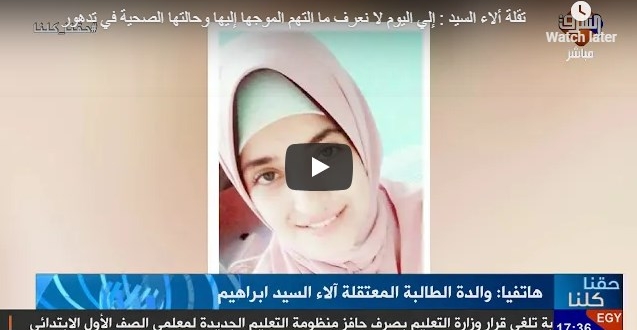 وقالت والدة آلاء، في مداخلة هاتفية لبرنامج “حقنا كلنا” على قناة “الشرق”: إن آخر زيارة لها كانت يوم الجمعة الماضي، وظهرت عليها حالة من الإعياء الشديد، وتعرضت للإغماء أكثر من مرة، وقامت الإسعاف بإفاقتها دون نقلها للمستشفى.