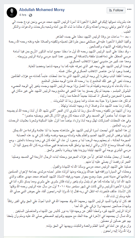 وكتب اليوم عبر صفحته على فيس بوك: “هذه بشريات نسوقها إليكم في النظرة الأخيرة لنا أسرة الرئيس الشهيد محمد مرسي ونحن نودع جسده إلى مثواه الأخير وتبقى روحه وأعماله وذكراه خالدة ما شاء الله بين أمته وشعبه بالرحمات والدعوات والذكر الطيب”.