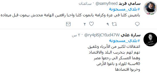 وكتب سام فريد: "يانعيش كلنا في عزة وكرامة يانموت كلنا واحنا رافعين الهامة محدش بيموت قبل ميعاده.. بلدي مسجونه لحين مايفهم الشعب ان اللي اتقتل واعتقل ماكان دور بطوله ده عشان حضرتك وحضرتي نعيش في امان ونفهم معني الرجوله"، فيما كتبت ساره علي :"اعتقالات لكثير من الأبرياء وتلفيق..تهم لهم بتخريب البلد والاقتصاد وهما العسكر الي رجعوا مصر 40سنة للوراء و باعوا الأرض وخربوا اقتصادها"