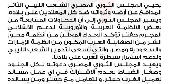 أشاد المجلس الثوري المصري ، بدفاع الشعب الليبي عن أرضه وثرواته وصموده ضد المحاولات المتتابعة من بعض الانظمة العربية والأوروبية لدعم الانقلابي خليفة حفتر.