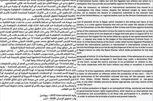 كما أكدت "دعمها الكامل للإجراء الذي قامت به مجموعة من المنظمات الحقوقية غير الحكومية – حيث تم تقديم طلب إلى قضاة المحكمة الجنائية الدولية، لأجل تفعيل الفقرة الثالثة من المادة 12 من نظام روما الأساسي للمحكمة، والذي فوض بموجبه الرئيس المصري السابق (الشهيد) محمد مرسي للقضاء الدولي ممثلاً في الجنايات الدولية للشروع في التحقيق في جرائم القتل التي وقعت أثناء فض الاعتصامات وذلك لتجاوز عائق عدم تصديق مصر على ميثاق روما، الذي يعقد الاختصاص للمحكمة الجنائية الدولية"، حسب البيان.