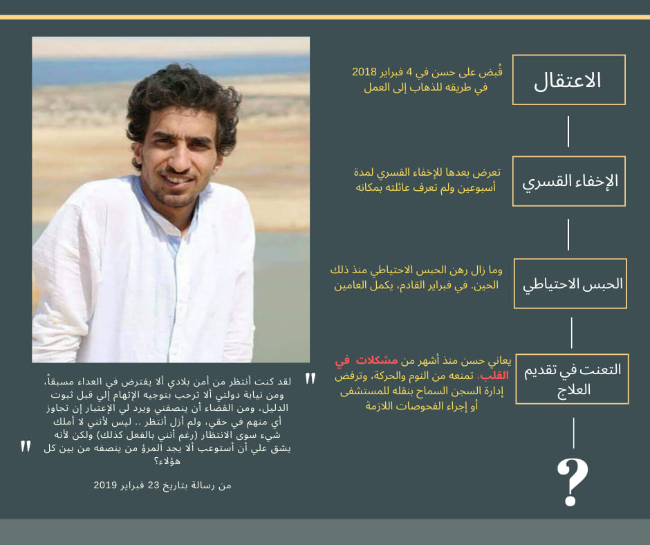 ونقل شاهد عيان من أفراد أسرته، وكان فى زيارته أمس الاثنين، واصفًا وضعه الصحى وفقًا لمشاهدته قائلا: “حسن تعبان جدا، وشه أصفر وشاحب، وخاسس، يعاني من اضطراب بضربات القلب (127/ د) في الراحة، والضغط العالي (103/168)، مع العلم أصلاً أنّ حسن من أصحاب الضغط المنخفض، بالإضافة إلى أنه يعاني من سخونة وضيق تنفس ورعشة مستمرة واحمرار بالأطراف وتورُّمها وحرقة بالصدر مع ألم بالكتف”.