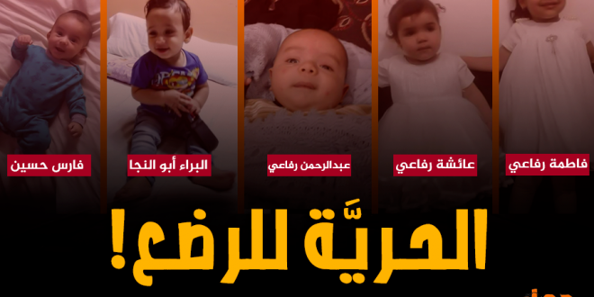 وناشد النشطاء كل من يهمه الأمر التحرك من أجل حرية الأطفال الرضع، والتضامن معهم والحديث عنهم على جميع المستويات؛ لفضح النظام الذي وصل إجرامه إلى أطفال رضع لا يملكون من أمرهم شيئًا.