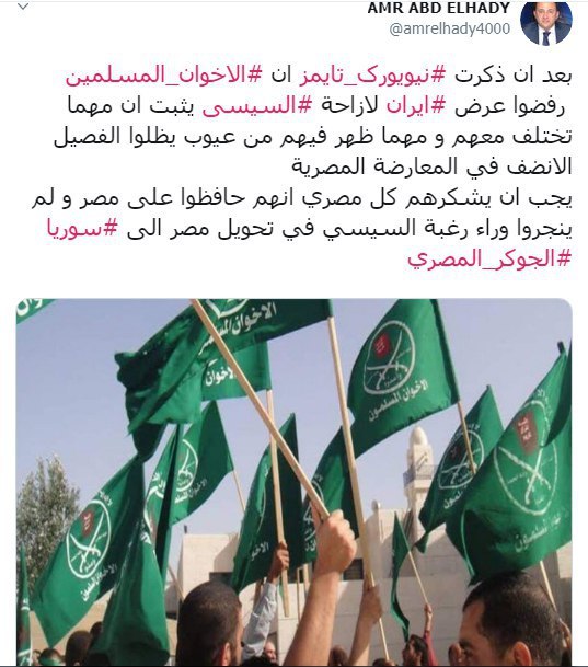 وقال عبد الهادي: “بعد أن ذكرت #نیویورک_تایمز أن #الاخوان_المسلمين رفضوا عرض #ايران لازاحة #السيسى يثبت أنه مهما تختلف معهم ومهما ظهر فيهم من عيوب يظلوا الفصيل الأنضف في المعارضة المصرية”، مضيفا: “يجب أن يشكرهم كل مصري أنهم حافظوا على مصر ولم ينجروا وراء رغبة السيسي في تحويل مصر إلى #سوريا”.