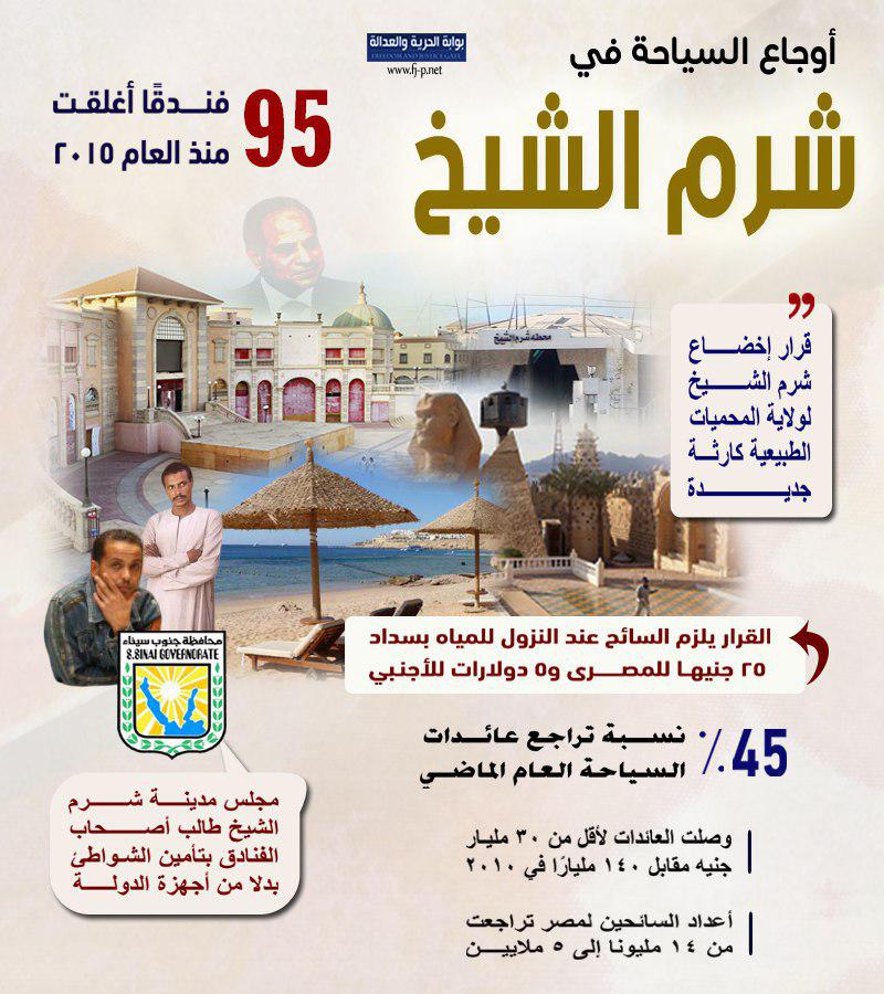 ما تزال السياحة المصرية تعاني في ظل سياسات السيسي، حيث قُدّمت مصر على أنها وجهة للإرهاب العالمي وليست وجهة سياحية، وسط قرارات غير مسئولة شلت السياحة في شرم الشيخ ومدن البحر الأحمر التي كانت قاطرة السياحة المصرية لعقود طويلة.