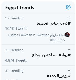 حساب "حسام نسيم" كتب عن أنَّ لكل ظالم نهاية، وأن "السيسي فاشل وهو نكرة وأصغر بكثير من أن يكون حاكما لمصر". أما حساب "3froto Syala" فقال ساخرًا "السيسي من شهر: ثورة 25 يناير عرّت كتف مصر.. السيسي حاليا: ثورة 25 يناير مطالبها نبيلة.. طاب هي عرّت كتف مصر ولّا مطالبها نبيلة؟.. السيسي هاااااا لا ما انتو مش فاهمين 25 يناير عرت كتف نبيلة.. الإعلاميين ومجلس النواب وسط تصفيق حار.. الله عليك يا ريس يا حكيم".
