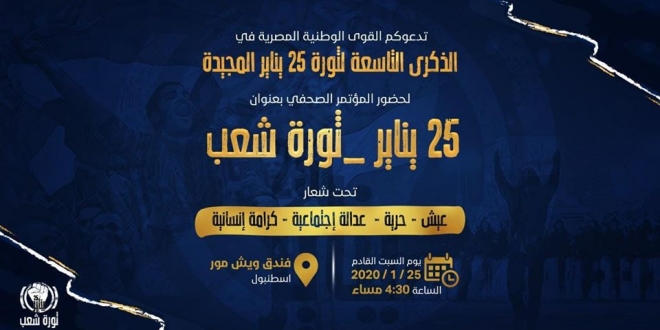 تُنظم القوى الوطنية المصرية، اليوم السبت، بالتزامن مع الذكرى التاسعة لثورة ٢٥ يناير المجيدة، مؤتمرًا صحفيًّا بعنوان 25″ يناير- ثورة شعب”.