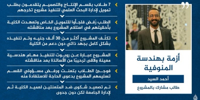 طالب بـ"هندسة المنوفية" ينشر عن تعنت يواجهه في الكلية بعد تنفيذه مشروع تخرجه مع زملائه على نفقتهم الخاصة وتفاعل واسع عبر وسم #وقف_جبروت_دكاترة_الجامعات pic.twitter.com/Q0llo7LIm9