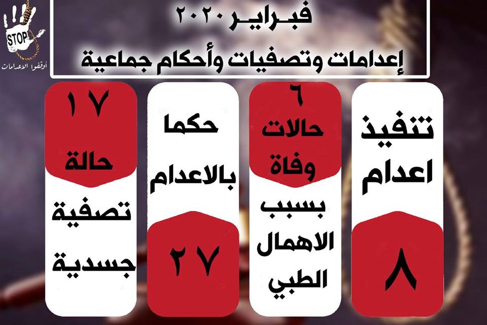 أصدرت حملة أوقفوا الإعدامات “إنفوجراف” يكشف إزهاق عصابة العسكر أرواح 31 بريئًا خلال شهر فبراير المنقضي من العام الجاري.