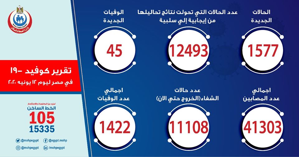 وقال خالد مجاهد، المتحدث باسم صحة الانقلاب، في بيان له، إنه تم تسجيل 1577 حالة جديدة ثبتت إيجابية تحاليلها معمليا للفيروس، ضمن إجراءات الترصد والتقصي التي تُجريها الوزارة، بالإضافة إلى وفاة 45 حالة جديدة، مشيرا إلى أن جميع الحالات المسجل إيجابيتها للفيروس بمستشفيات العزل والحجر الصحي، لافتا إلى خروج 417 من المصابين بفيروس كورونا من مستشفيات العزل والحجر الصحي، ليرتفع إجمالي المتعافين من الفيروس إلى 11108 حالات حتى اليوم.