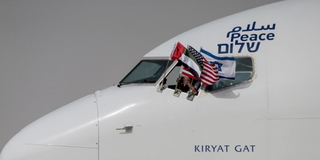 الطائرة التي تحمل الوفدين الأمريكي والصهيوني إلى أبو ظبي تحمل كلمة "السلام" المكتوبة عليها باللغات الإنجليزية والعبرية والعربية. كما سميت باسم كريات غات، وهي مستوطنة يهودية بنيت على بقايا قريتين فلسطينيتين مطهرتين عرقياً، هما العراق المنشية والفلوجة.