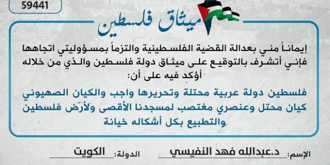 قفزت أعداد المشاركين في "ميثاق فلسطين" مع نهاية اليوم الثاني، الثلاثاء 15 سبتمبر، للتوقيعات إلى نحو نصف مليون توقيع من مسلمين وعرب، مع إقبال فائق من فلسطين ومصر والكويت.