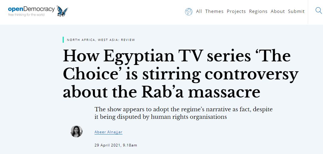 نشر موقع "أوبن ديموقراسي" الأمريكي مقالا بعنوان "كيف يثير المسلسل التلفزيوني المصري "الاختيار" الجدل حول مذبحة رابعة" للباحثة عبير النجار قالت إنه "يبدو أن المسلسل يتبنى رواية نظام السيسي على أنها حقيقة ، على الرغم من تنازعها من قبل منظمات حقوق الإنسان".
