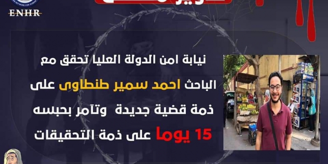 استمرارا لجرائم التدوير التي تنتهجها سلطات النظام الانقلابي تم تدوير الباحث أحمد سمير سنطاوي، المعتقل بسجن طره، بعد عرضه على نيابة الانقلاب العليا، السبت 22 مايو الجاري، وقررت حبسه 15 يوما على ذمة التحقيقات في قضية جديدة تحمل رقم 877 لسنة 2021.