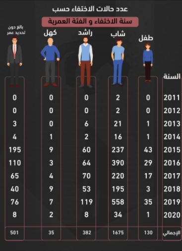 ووثق التقرير أن عدد حالات الأطفال القصر من بين حالات الإخفاء القسري وصل إلى 6% بـ130 حالة منها 43 حالة فى عام 20125 و36 حالة فى عام 2019م، بينما سجلت الفئات العمرية شاب وراشد وكهل 94% من الحالات. واحتل الشباب النسبة الأكبر من بين حالات الإخفاء القسري بنسبة 60% من إجمالي حالات الإخفاء القسرى بـ1675 شابا، فيما سجلت الحملة 35 حالة إخفاء قسرى لما فوق عمر الـ60.