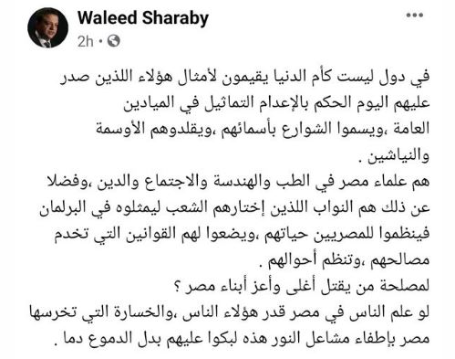 وأضاف المحامي ممدوح إسماعيل @mamdouh_ismail_ أن "تأييد الحكم بإعدام 12من الإخوان هو قرار سياسى انتقامى من عشماوى مصر السيسى ويكفى على رأسهم البلتاجي والد الشهيدة أسماءوأستاذ الأزهر عبدالرحمن البر والمحامي الحر عصام سلطان والداعية صفوت حجازى.. يارب السيسى طغى ولايملك شيئا وأنت ياربنا مالك الملك فأرنا في السيسى وعصابته آياتك".