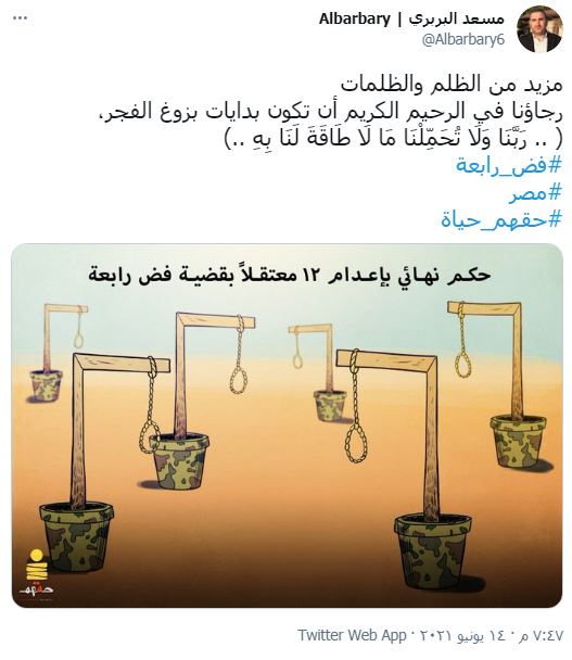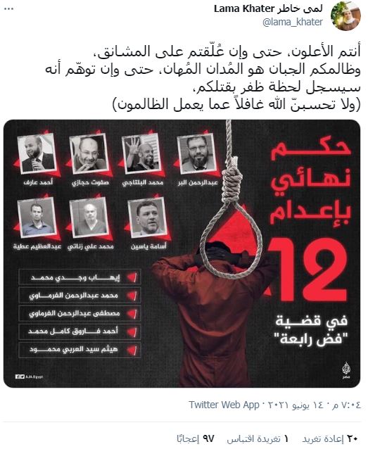 أما الصحفي أحمد عبد العزيز، فكتب عبر @AAAzizMisr، "الحكم (اليوم) بتأييد إعدام 14 من قيادات الإخوان المسلمين، هو جريمة جديدة، تضاف إلى جرائم الانقلاب، بحق أشرف من أنجبت مصر! نؤمن بأن النفس لا تموت حتى تستوفي رزقها، وأن يلقى المسلمُ ربه شهيدا، خير من أن يموت على فراشه كما يموت البعير.. نرضى بقضاء الله، ونشكو إليه هواننا على الناس!