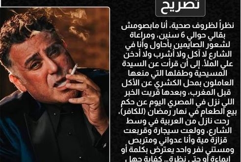 وقال حبيب “نظرا لظروف صحية، أنا ما بصومش بقالي حوالي 6 سنين، ومراعاة لشعور الصايمين بحاول وأنا في الشارع لا آكل ولا أشرب ولا أدخن على الملأ" مضيفا أنه نظرا لحالة الأسرة الكتابية التي عرضت مشكلتها على الفيسبوك، قرر المجاهرة بفطره منتظرا العنف اللفظي والبدني لمن يعترض مدعيا أن له عذرا.