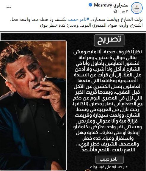 أفزع السيناريست تامر حبيب العديد من المصريين على مواقع التواصل الاجتماعي؛ بسبب حديثه عن مجاهرته بالإفطار دون مراعاة آداب الصيام أو حدود الإفطار بعذر سواء أدبيا أو دينيا، وذلك لدى تعليقه على حادث رفض عمال مطعم كشرى التحرير تقديم الطعام لأسرة مسيحية في صالة المطعم الشهير بالقاهرة، إلا بعد المغرب، مع قبولهم منح العائلة علب الكشري.
