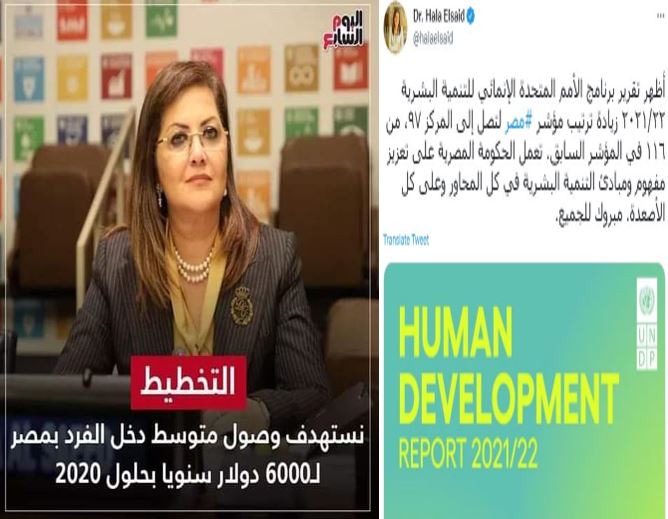 وتعمدت وزيرة التخطيط إظهار الجانب الحسن من التقرير الذي لم يسجل أي ملاحظات على أداء حكومة السيسي وقال د.هالة السعيد (@halaelsaid) "أظهر تقرير برنامج الأمم المتحدة الإنمائي للتنمية البشرية ٢٠٢١/٢٢ زيادة ترتيب مؤشر مصر لتصل إلى المركز ٩٧ من ١١٦ في المؤشر السابق، وتعمل الحكومة المصرية على تعزيز مفهوم ومبادئ التنمية البشرية في كل المحاور وعلى كل الأصعدة ومبروك للجميع".