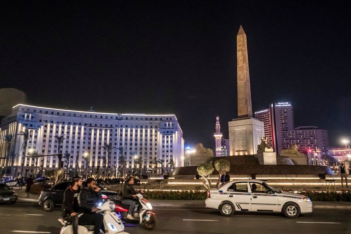وفي ميدان التحرير الذي كان مضاء في العاصمة ذات يوم، تتوهج المسلة الفرعونية وأبو الهول بشكل خافت، في حين تم إطفاء الأنوار في المباني والشوارع المحيطة.