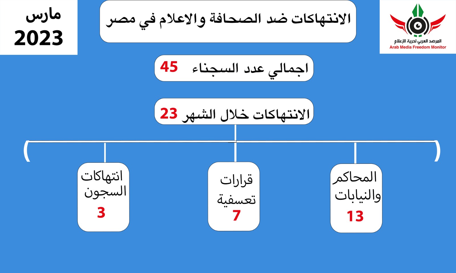 رصد المرصد العربي لحرية الإعلام  (اكشف ) خلال تقريره عن انتهاكات حرية الإعلام في مصر لشهر مارس 2023 المنصرم 23 انتهاكا مع استمرار حبس 45 صحفيا وصحفية، بينهم 13 نقابيا، بعد الإفراج عن صحفيين اثنين.