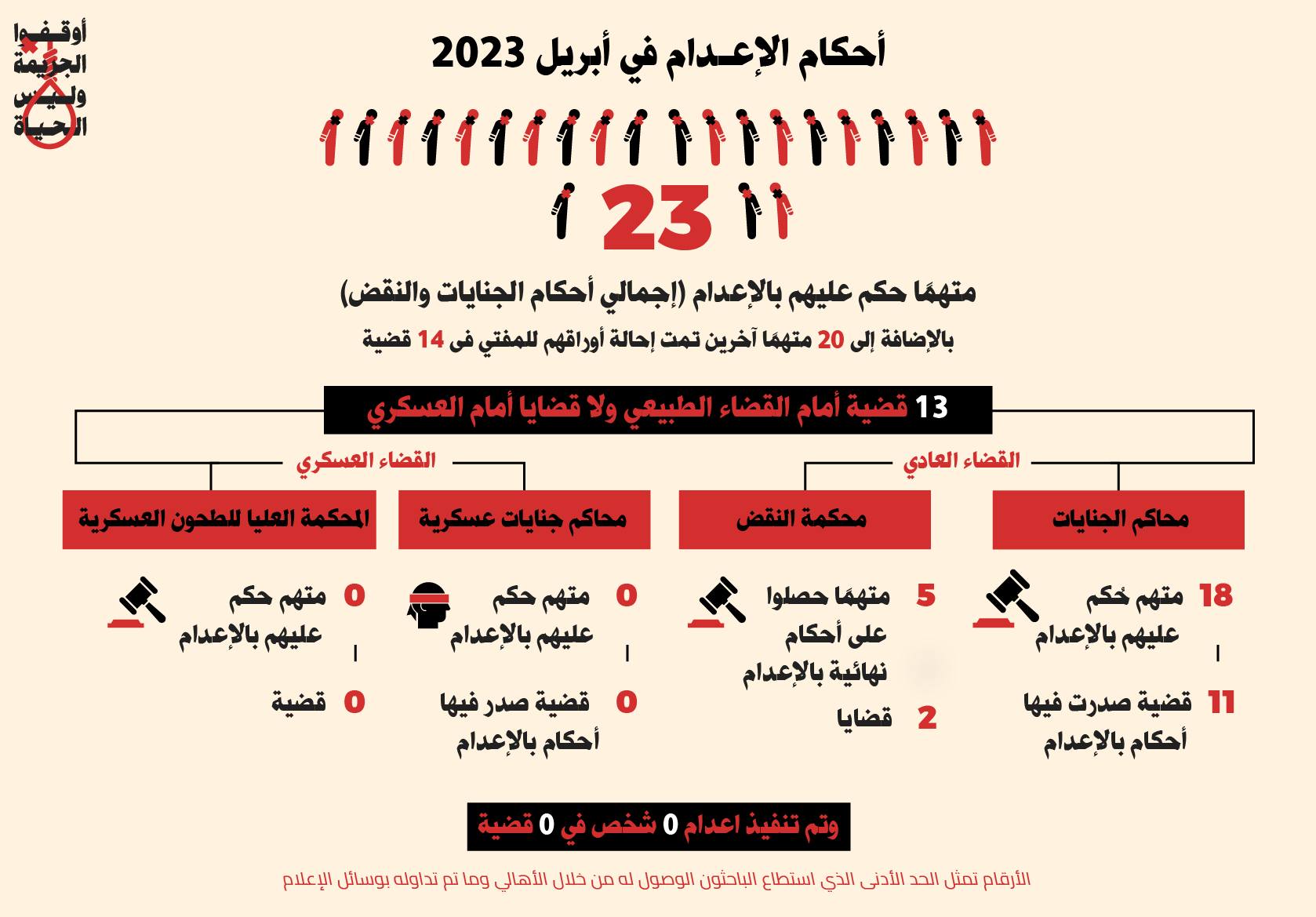 أصدرت المبادرة المصرية للحقوق الشخصية تقريرها الإحصائي الشهري ، بشأن عقوبة الإعدام في مصر، رصدت فيه صدور 23 حكما بالإعدام خلال أبريل الماضي 2023 ، إضافة لإحالة أوراق 20 مواطنا في 14 قضية إلى مفتي العسكر تمهيدا للحكم بإعدامهم.