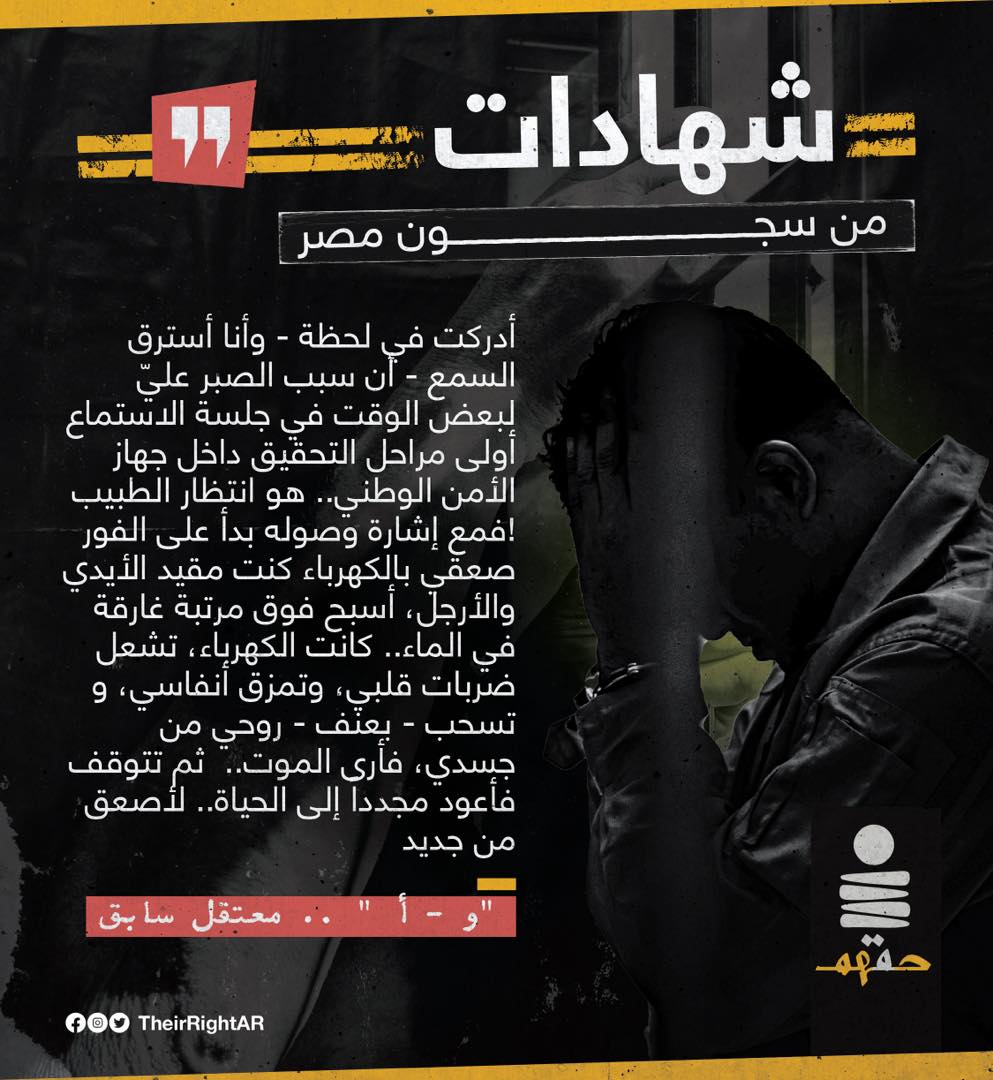 وأوردت "حقهم" شهادة معتقل سابق داخل سجون النظام الانقلابي قال فيها : "أدركت في لحظة ـ وأنا استرق السمع – أن سبب الصبر عليّ لبعض الوقت في جلسة الاستماع أول مراحل التحقيق داخل جهازالأمن الوطني، هو انتظار الطبيب".