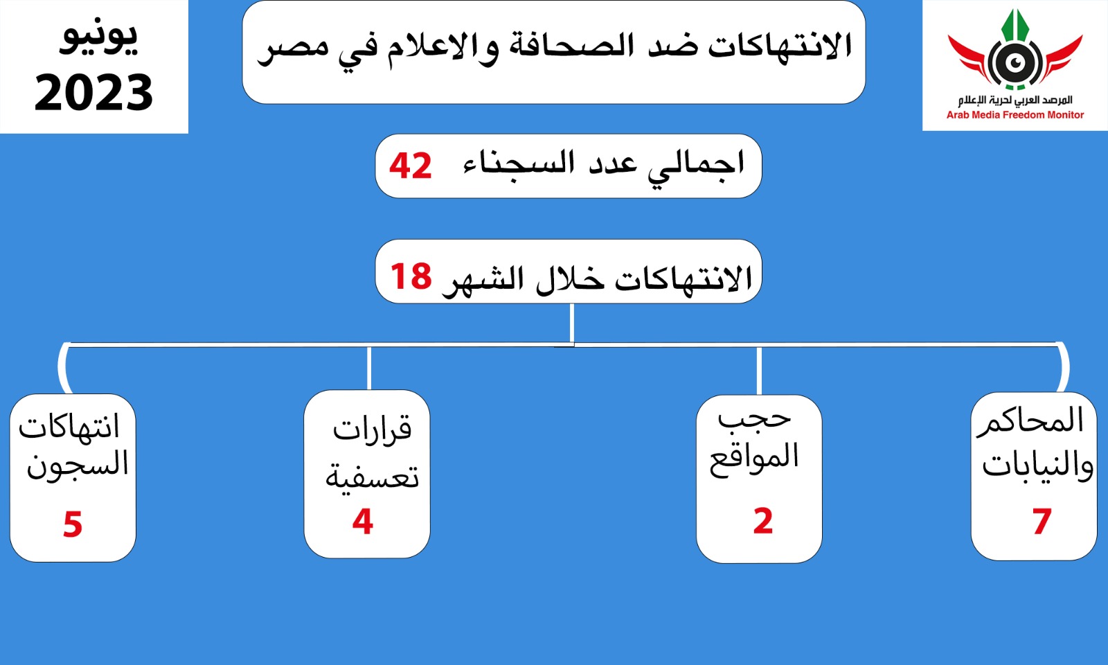 ووثق المرصد خلال شهر يونيو 2023 ، 18 انتهاكا، تصدرها انتهاكات المحاكم والنيابات “7” انتهاكات، وبلغت الانتهاكات بمقار الاحتجاز والسجون 5 انتهاكات، فيما أماكن رصد 4 انتهاكات في باب القرارات الإدارية التعسفية، مع انتهاكين في الحجب فضلا عن استمرار الحبس بنهاية الشهر المنصرم ل 42 صحفيا وصحفية، بينهم 11 نقابيا بجانب 5 صحفيات هن منال عجرمة، وصفاء الكوربيجي، وهالة فهمي، ودينا سمير، وعلياء عواد بعد الإفراج عن صحفي واحد فقط قبل عيد الأضحي وهو الكاتب الصحفي محمد مصطفى موسى.
