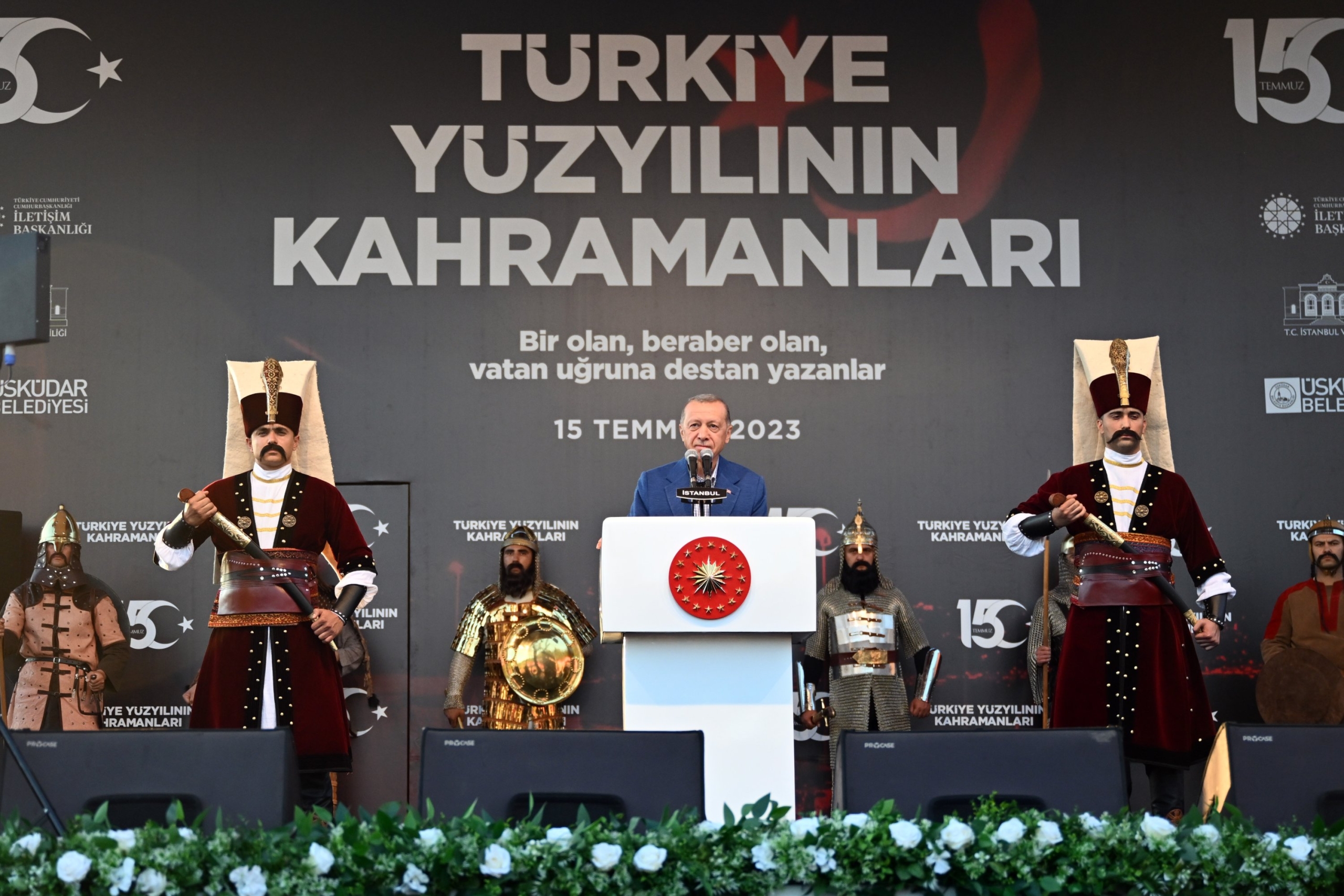 وأشار أردوغان إلى أن هناك لحظات محورية في تاريخ الأمم، وقال: "15 يوليو هو علامة فارقة بالنسبة لنا، إنها واحدة من أهم مراحل كفاحنا الذي دام ألف عام لجعل أراضي الأناضول وطننا وكفاحنا الذي دام 200 عام من أجل البقاء".
