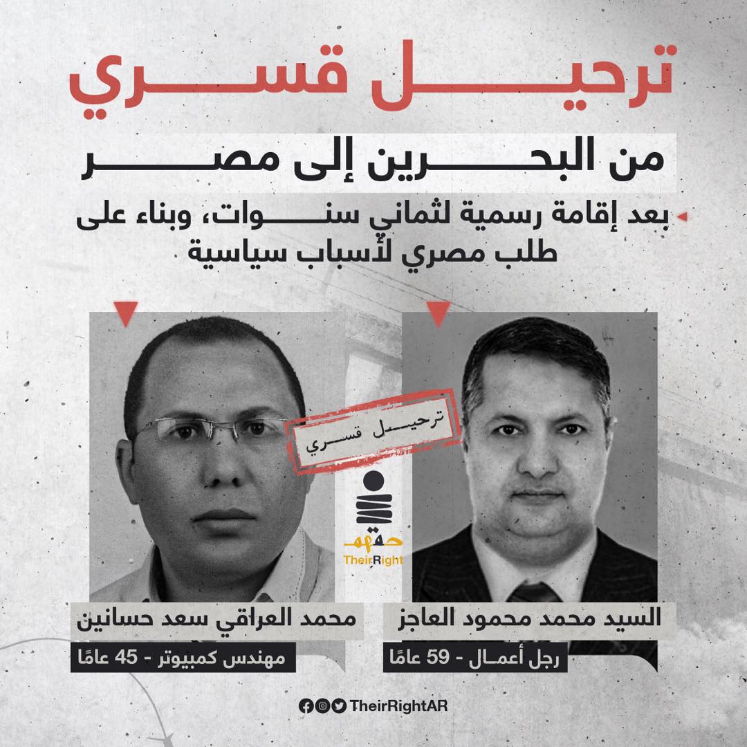 كما رصدت أيضا ترحيل وتسليم مهندس الكمبيوتر محمد العراقي سعد حسانين، 45 سنة، وأب لثلاثة أبناء ومقيم بمملكة البحرين بصفة قانونية منذ 8 سنوات، والمحكوم عليه بالسجن المؤبد غيابيا في القضية المعروفة إعلاميا بمذبحة فض اعتصام رابعة من محكمة افتقدت الإجراءات فيها إلى أدنى معايير المحاكمات العادلة، و بناء على ادعاءات تفتقر إلى المصداقية.