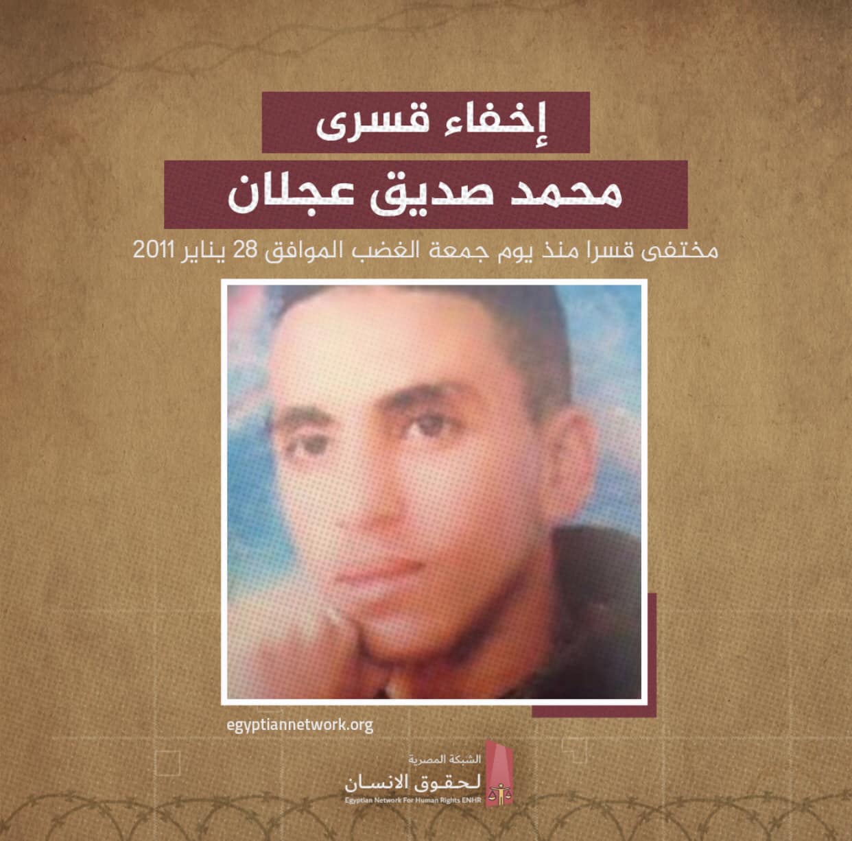 من ناحية أخرى وثقت الشبكة المصرية لحقوق الإنسان إخفاء محمد صديق توفيق عجلان، 34 عاما، خريج كلية تجارة جامعة حلوان، قسرا منذ جمعة الغضب الموافق 28 يناير 2011 .