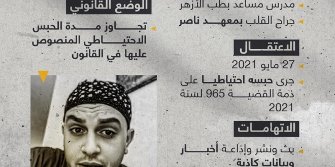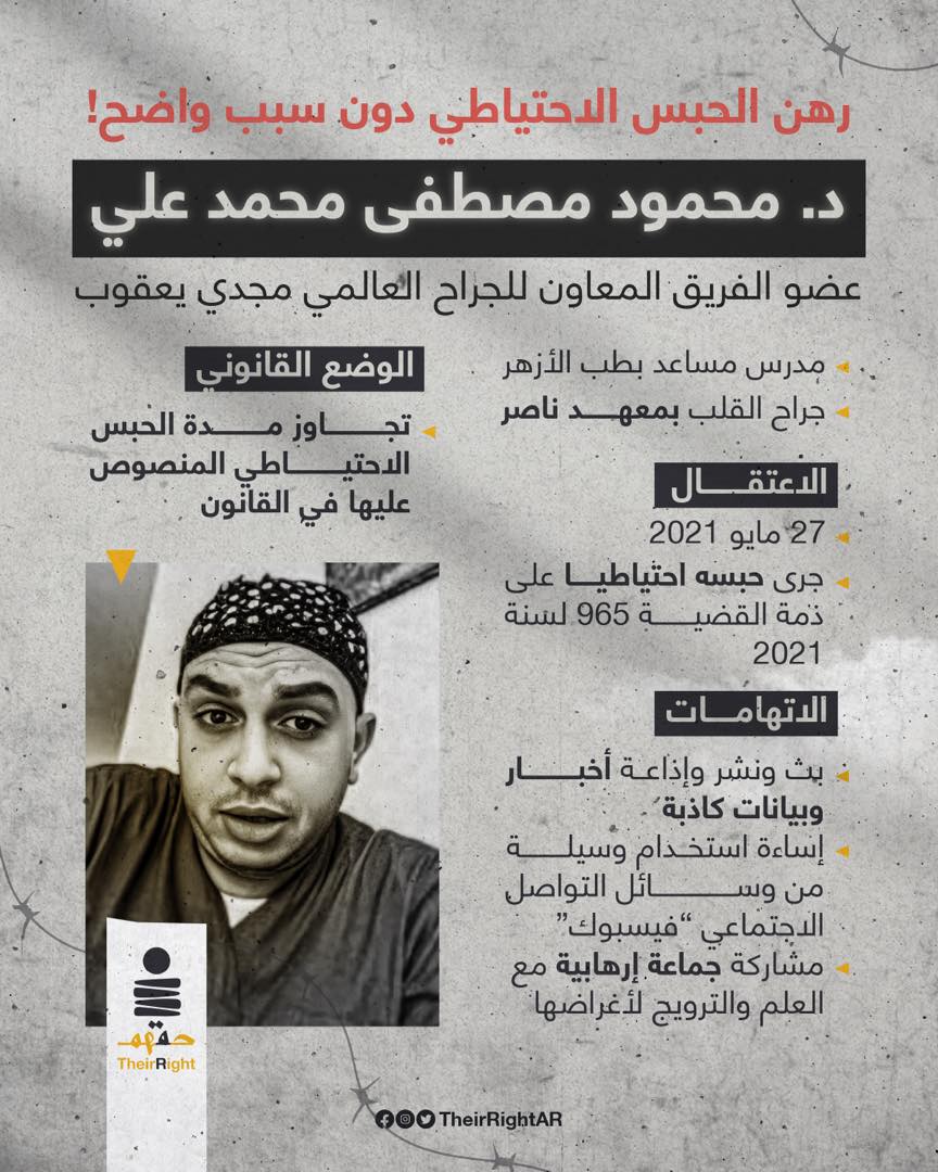 إلى ذلك أكدت منظمة حقهم المعنية بالدفاع عن معتقلي الرأي على تجاوز طبيب القلب محمود مصطفى محمد علي، سنتين رهن الحبس الاحتياطي دون سبب واضح، بعدما تم اعتقاله بشكل مفاجئ في 27 مايو 2021.