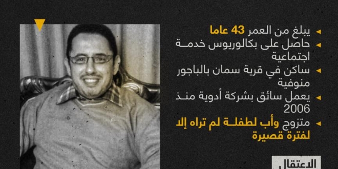 وذكرت أنه على مدار أكثر من 8 سنوات تعرض خلالها لصنوف من التنكيل عبر الانتهاكات المتنوعة، حيث أُخفي قسريا أول اعتقاله لمدة 10 أيام بمقر أمن الانقلاب بالإسماعيلية، ثم تم عرضه على ذمة القضية رقم 45/251 حصر إداري عسكري لسنة 2015 وتم الحكم عليه بالسجن لمدة 5 سنوات.