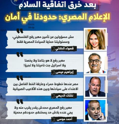 وشكلت سيطرة الكيان على معبر رفح من الجانب الفلسطيني واجهة برامج القنوات المصرية مساء الثلاثاء، هكذا طالب بعضهم بإلغاء معاهدة السلام مع الكيان الصهيوني، فيما قال آخرون مصر مالها أساسا.