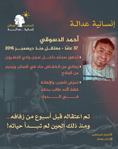 واهتمت الحملة بحالة الشاب أحمد الدسوقي، 37 عاما، والذي كان يستعد لحياته الزوجية، إلا أن قدره ساقه إلى معتقل دخل زنزانة باردة في سجن وادي النطرون "تأهيل 9"، بعد أن اعتُقل يوم 17 ديسمبر 2016، قبل أسبوع فقط من موعد زفافه.
