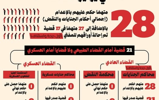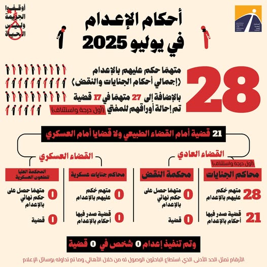 أصدرت محاكم سلطة الانقلاب في مصر  أحكاماً بالإعدام على 28 متهماً في 21 قضية، كما أحالت النيابة أوراق 27 متهماً للمفتي في 17 قضية أخرى، خلال شهر يوليو/تموز الماضي، حسب المبادرة المصرية للحقوق الشخصية، التي قالت، اليوم الثلاثاء، إنّ هذه الأرقام تُمثل الحد الأدنى الذي نجح الباحثون في توثيقه عبر عائلات المتهمين وتغطيات وسائل الإعلام المحلية، وتُدرَج هذه الأرقام مؤشراً على وتيرة الأحكام وليست حصيلة نهائية رسمية.