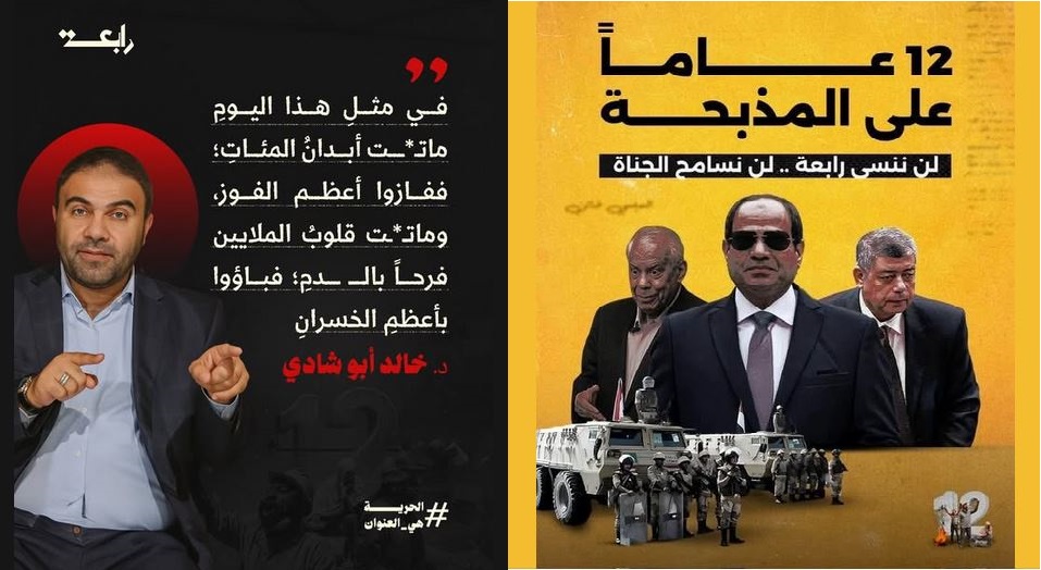 12 سنة مرت على أكبر وقائع القتل الجماعي لمتظاهرين سلميين في يوم واحد في التاريخ الحديث، وعلى قتل العسكر في مصر لزينة الرجال والشباب والنساء وبداية أسوأ حقبة قمعية في تاريخ مصر الحديث، على فض اعتصامي رابعة والنهضة السلميين بالقوة المفرطة، وعبر هاشتاجات #رابعة و#لن_ننسى_رابعة و#رابعة_لن_ننسى و#رابعة_العدوية و#رابعة_الحرية_هي_العنوان و#ذاكرة_رابعة .. وعبّر ناشطون عن أنها ستظل في الذاكرة، والدماء لم تجف لأن الأرض لا تشرب الدماء طالما بقيت بلا قصاص.
