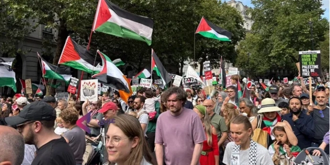 شهدت العاصمة البريطانية لندن، السبت، واحدة من أضخم المظاهرات في تاريخها الحديث، حيث تدفق أكثر من 300 ألف متظاهر إلى شوارع وسط المدينة للمشاركة في المسيرة الوطنية الثلاثين من أجل فلسطين، والتي تزامنت مع “اليوم العالمي للعمل من أجل غزة”.