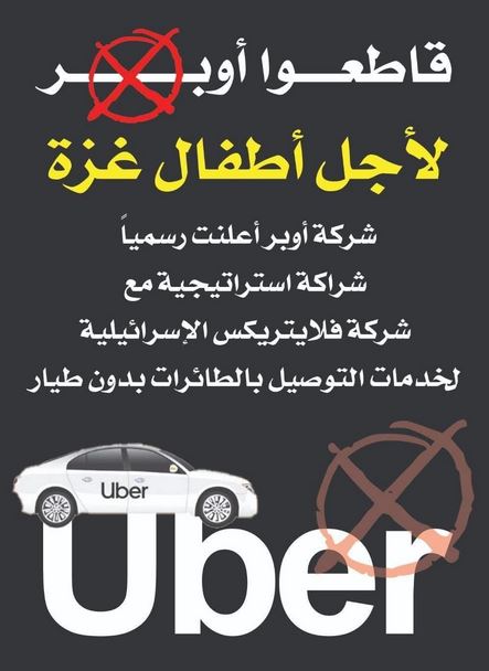 وفي يوليو 2020، أعلنت شركة أوبر دعمها للاحتلال الصهيوني بعد ما أرسلت إيميل لمطعم في كندا يدافع عن فلسطين تقول فيه إنها ستقطع كامل العلاقات مع المطعم وخدمة التوصيل بشكل فوري. #قاطعوا_أوبر ولا تنسوا تقاطعوا كريم كمان!".