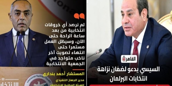 وتساءل متندرا "ينفى (السيسي) تدخله في عمل الهيئة الوطنية المفترض أنها مستقلة للانتخابات ، ولكن توجيهه لها بإلغاء الانتخابات البرلمانية كلها أو في بعض الدوائر سابقة خطيرة تدل على أن الأمر أصبح أخطر من أن يتحمل للنظام تبعاته، عموما هذه تدخل لست بصراحة ضده، أتمنى أن يكون القرار إعادة الانتخابات بالكامل، وهو يكشف ضمن ما يكشف عن أن المسؤولين المحليين تغولوا وتجاوزوا دورهم وشابت ادارتهم للانتخابات فساد كبير".