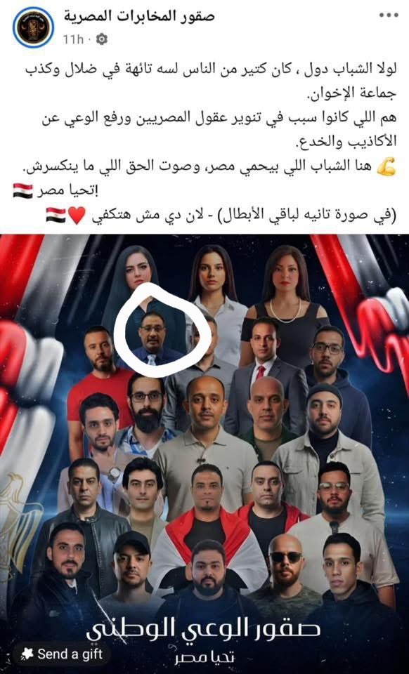 وكتب سامي كمال الدين@samykamaleldeen "صقور لمخابرات المصرية هى صفحة موثقة على فيس بوك يتابعها 480 ألفا، نشرت هذه الصورة وقالت هؤلاء صوت الحق الذي يشكل وعي الشعب و يحمي مصر!.. أحدهم- محمد قنديل- كتب أنه يحصل على الراتب من الأمن الوطني الإماراتي ، هو وعدد من اليوتيوبرز في مصر.. السؤال: هل هذه الصفحة الموثقة تمولها الإمارات وهل كل لجان السيسي الموجودين فى الصورة يحصلون على راتب من مخابرات الإمارات ؟! أم أن البلد كلها تحت إدارة الإمارات ؟! ثم السعودية فين من الموضوع …