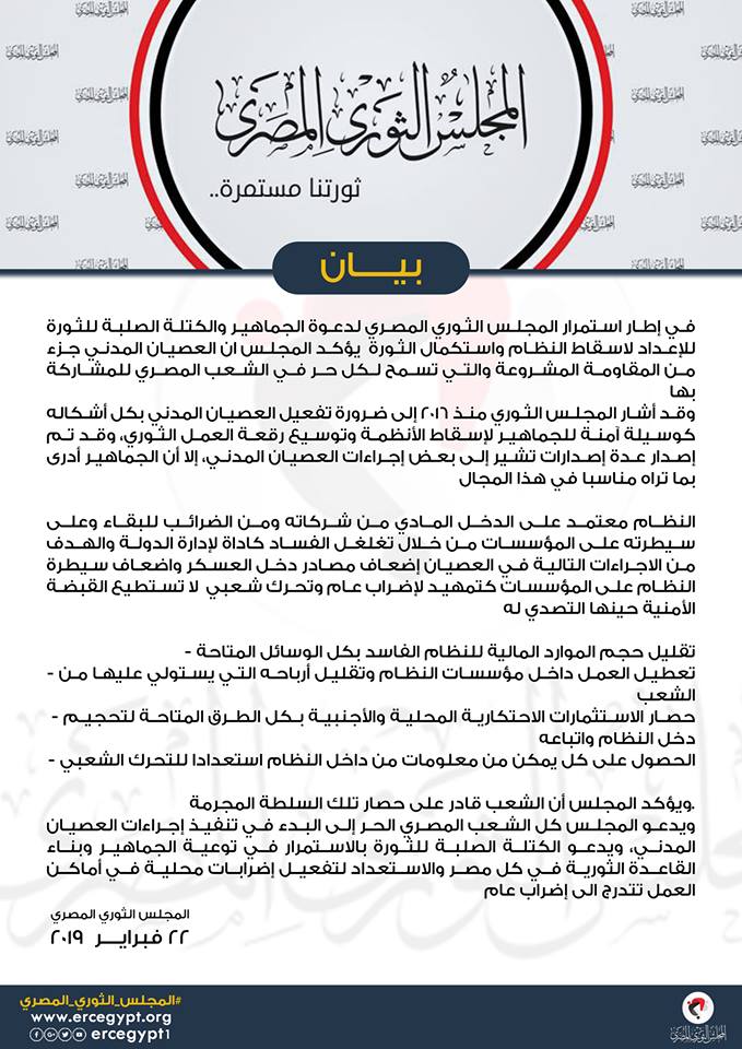 دعا المجلس الثوري المصري “الكتلة الصلبة للثورة” للإعداد لإسقاط النظام واستكمال الثورة، مشيرا إلى أن العصيان المدني جزء من المقاومة المشروعة والتي تسمح لكل حر في الشعب المصري ...