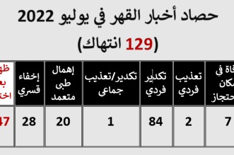 رصد أرشيف القهر لشهر يوليو المنقضي 2022 الصادر عن مركز النديم لمناهضة العنف والتعذيب 129 انتهاكا متنوعا وظهور 147 من المختفين قسريا لفترات متفاوتة أثناء عرضهم على نيابة أمن الدولة العليا. وشملت الانتهاكات وقفة ...